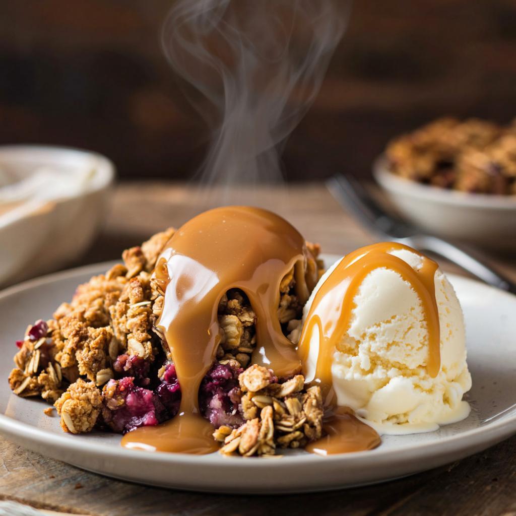 - Подаем. Дайте десерту немного остыть. Подавайте теплым, возможно, с шариком ванильного мороженого. Горячий крамбл и тающий холодный пломбир — это чистая магия!