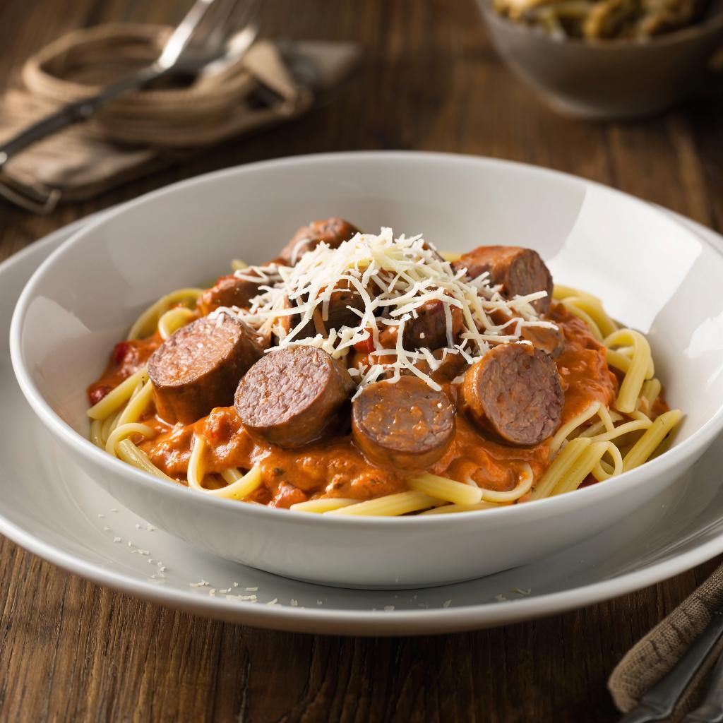 🍝 Паста с колбасой «Говяжья» в томатно-сливочном соусе