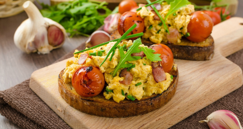 - Выложите получившуюся болтунью поверх гренки. Можете украсить помидором-черри или зеленым луком.