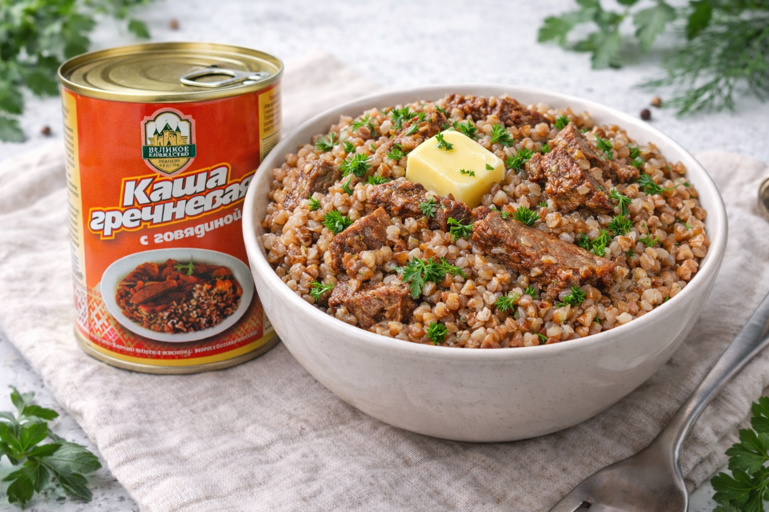 - Каша гречневая с говядиной, Калинковичский МК — 1 банка (340 г)
