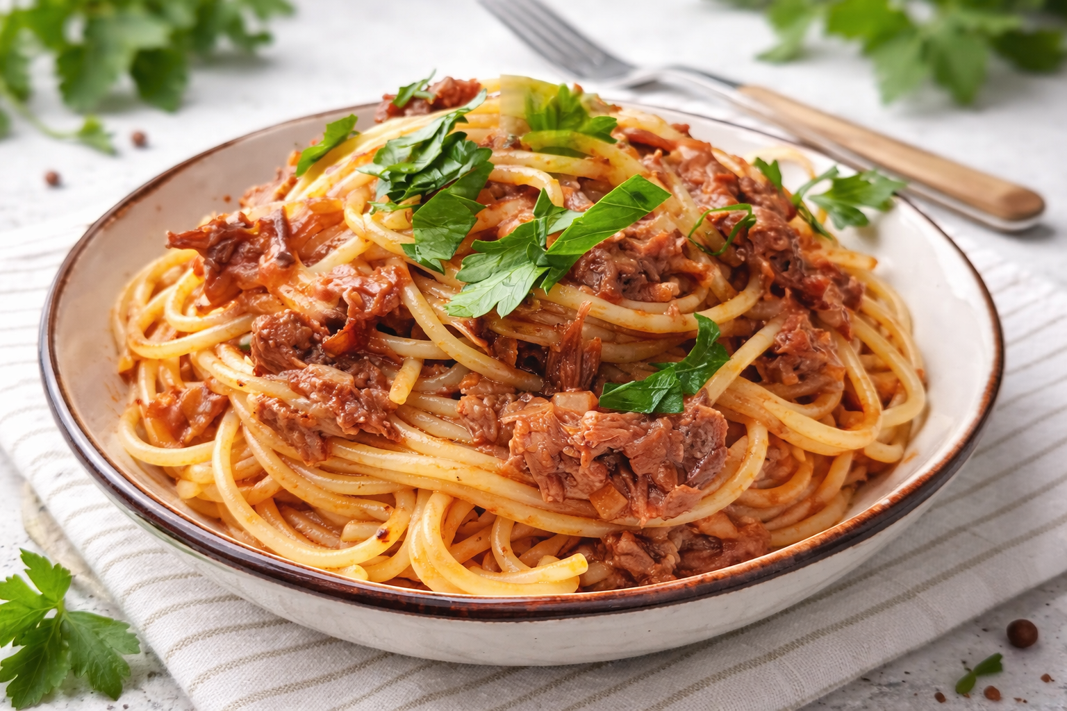 Добавьте готовые спагетти в сковороду к мясному соусу, тщательно перемешайте, прогрейте ещё 2–3 минуты, чтобы макароны пропитались вкусом. -