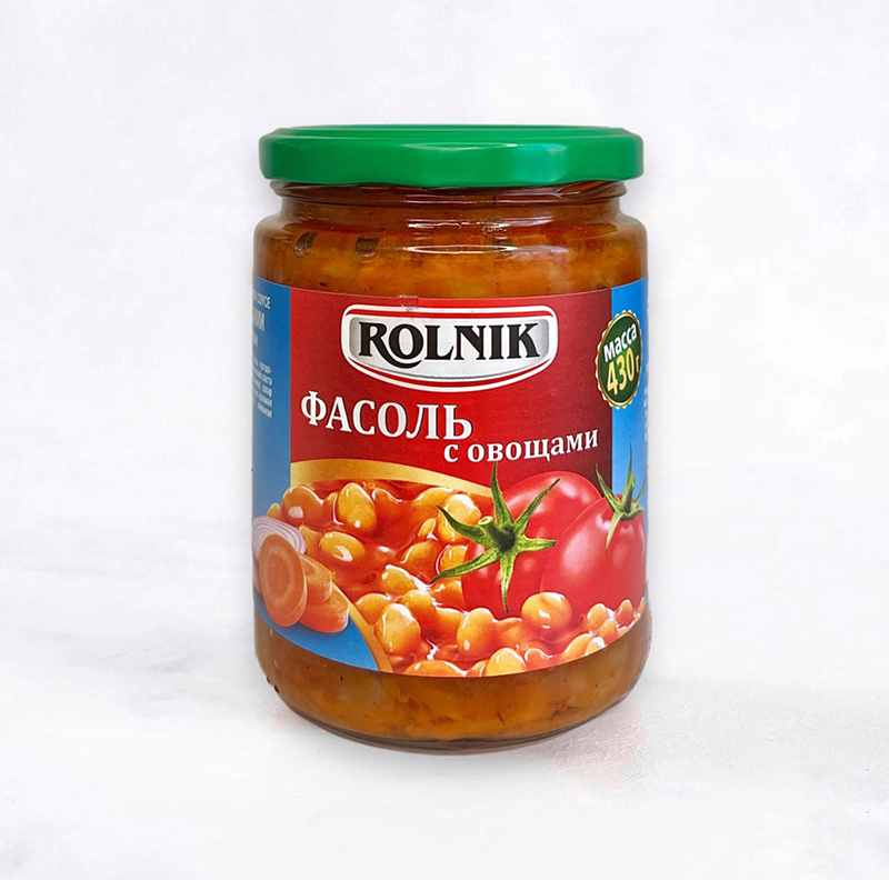 вода питьевая, фасоль продовольственная, паста томатная, лук репчатый свежий, сахар белый, масло подсолнечное рафинированное, мука пшеничная первого сорта, соль поваренная пищевая йодированная, крахмал кукурузный, регулятор кислотности - лимонная кислота, чеснок сушеный, перец черный молотый, перец красный молотый.