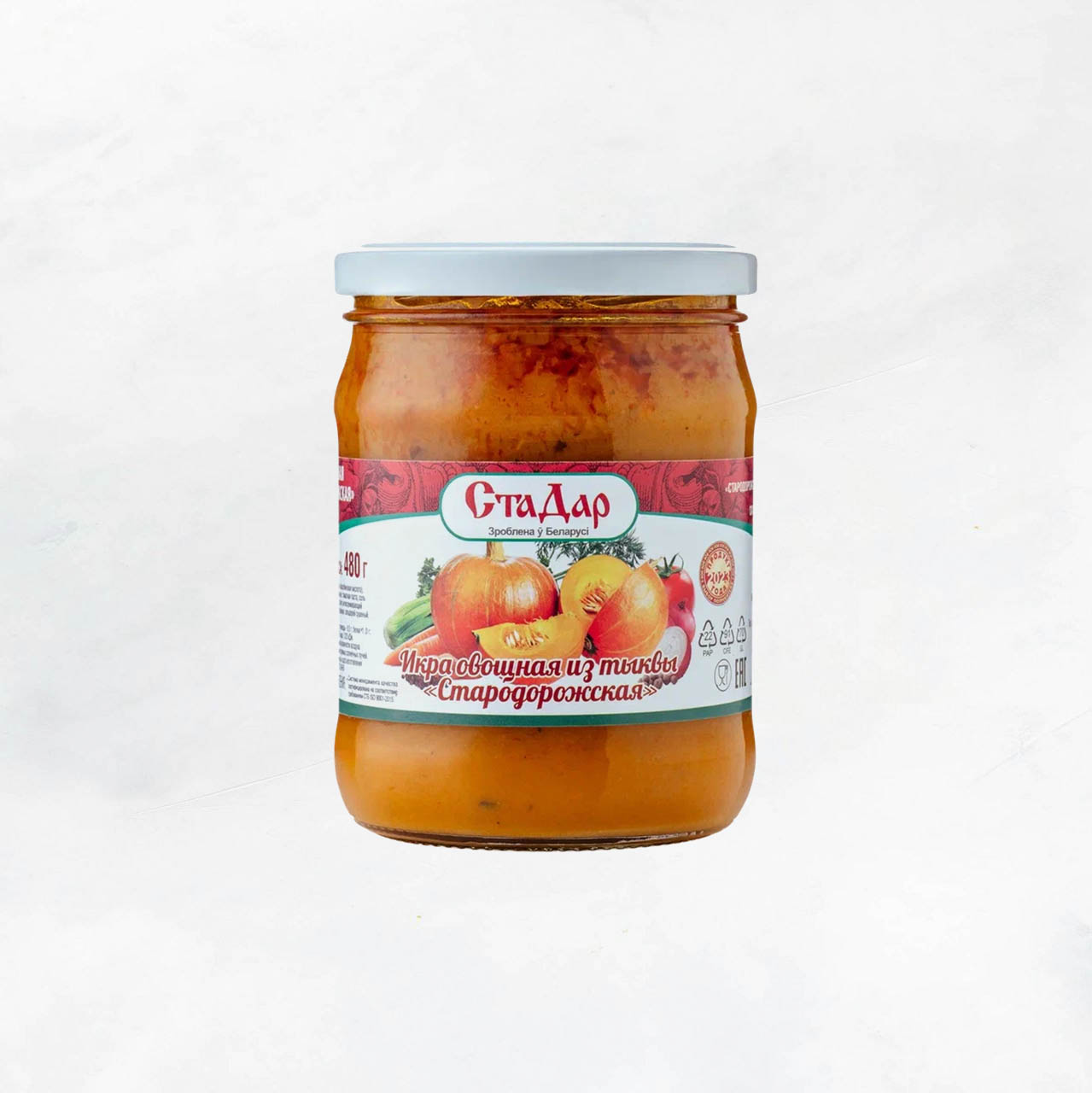 пюре из тыквы (тыква свежая, антиокислитель – аскорбиновая кислота), лук репчатый свежий, морковь свежая, масло растительное, томатная паста, соль пищевая поваренная йодированная (соль, йодат калия, агент антислеживающий ферроцианид калия), сахар, укроп сушеный, петрушка сушеная, сельдерей сушеный, перец черный молотый, перец душистый молотый