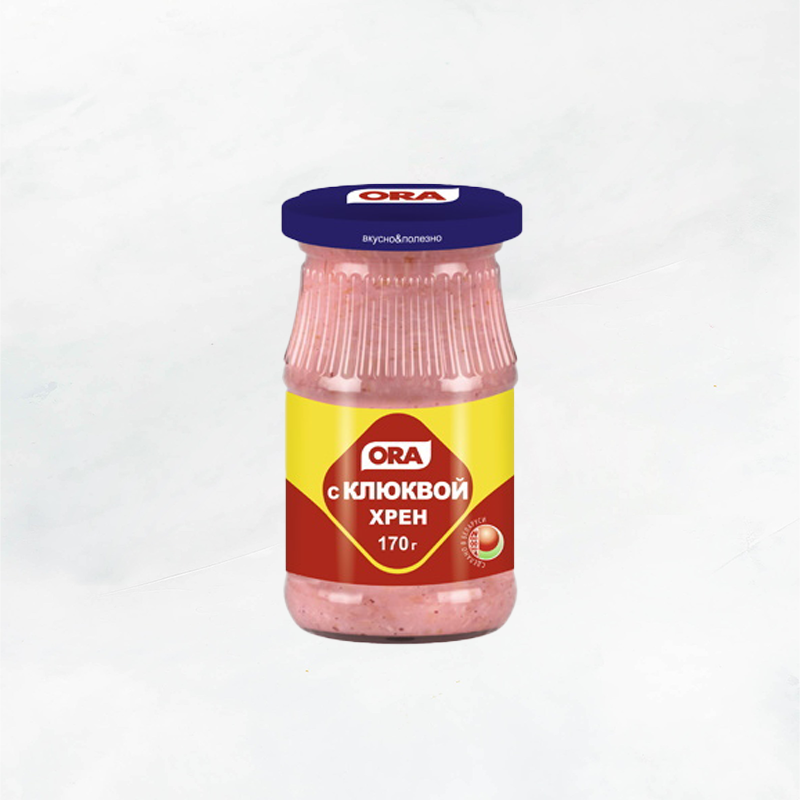 Корень хрена свежий, вод питьевая, масло растительное, сахар, соль поваренная пищевая йодированная, регулятор кислотности уксусная кислота, клюква, загустители: гуаровая и ксантовая камеди, консервант бензоат натрия, краситель Аннато