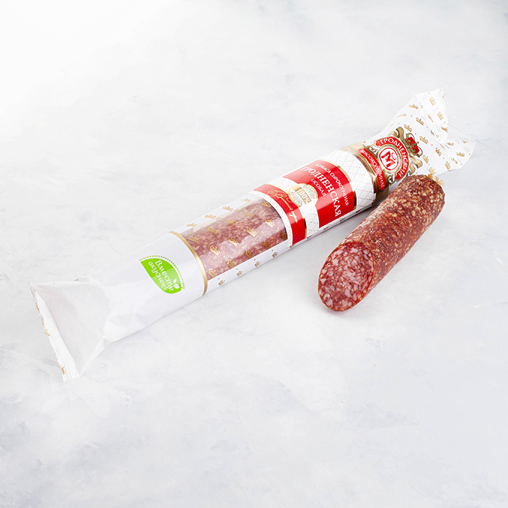 свинина, шпик, говядина, жир-сырец свиной, соль, агент антислеживающий ферроционид калия, фиксатор окраски нитрит натрия, йодат калия, натуральные пряности (черный перец, горчичный порошок, тимьян, мускат), регулятор кислотности глюконо-дельта лактон, усилитель вкуса и аромата натриевая соль, антиокислители изоаскорбат натрия, декстроза, лактоза, краситель кармин, перец душистый, мускатный орех.