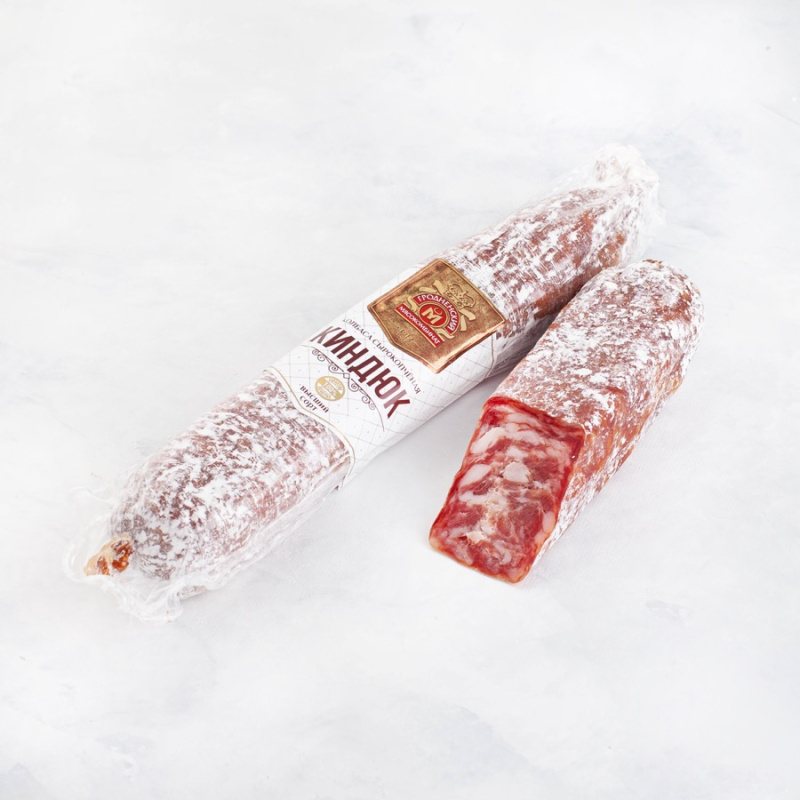 свинина, говядина, комплексная пищевая добавка (соль (содержит йодат калия), фиксатор окраски), усилитель вкуса и аромата, антиокислитель, натуральный ароматизатор, экстракт паприки, сельдерей, ароматизатор, стартовая культура. Обсыпка – рисовый крахмал.