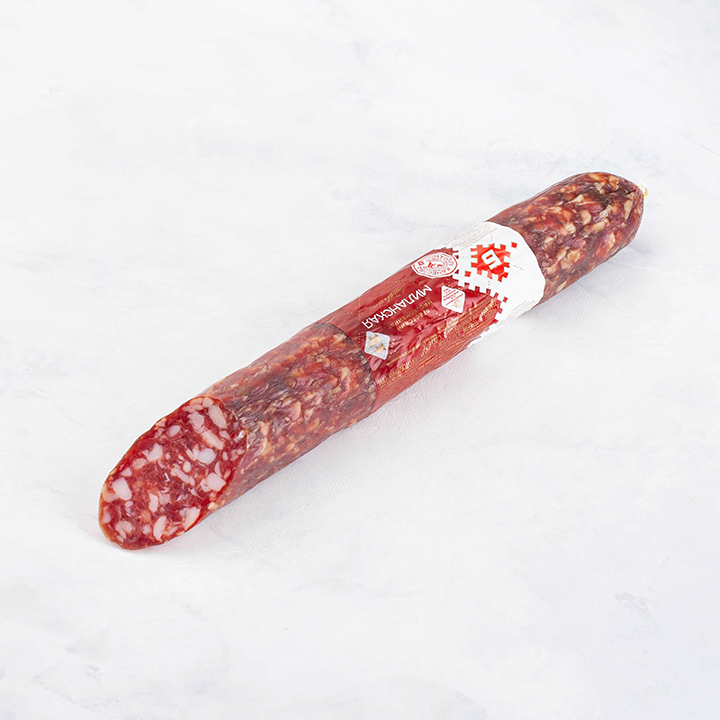 свинина, говядина, комплексная пищевая добавка для мясной продукции с йодом (соль пищевая, фиксатор окраски, йодат калия), комплексная пищевая добавка (декстроза, сахар, усилитель вкуса и аромата, антиокислитель, натуральный ароматизатор (перец чили), рапсовое масло, пряности (мацис, перец), экстракт пряностей (паприка), комплексная пищевая добавка (регулятор кислотности, сахароза, антиокислитель; сироп глюкозы, специи чеснок, сельдерей, перец, лук), гидролизат растительного белка, ароматизатор, экстракт паприки.