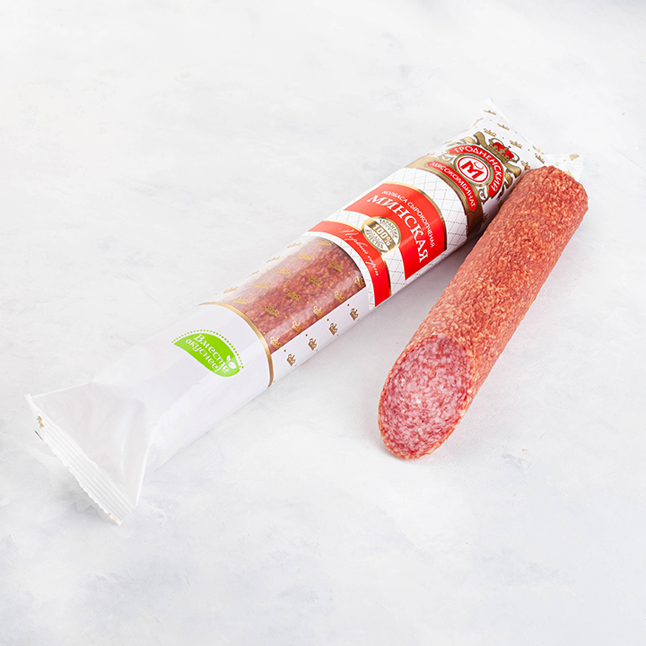 свинина, шпик, говядина, жир-сырец свиной, комплексная пищевая добавка (соль (содержит йодат калия), фиксатор окраски), усилитель вкуса и аромата, антиокислитель, натуральный ароматизатор (чили), мацис, перец, экстракт паприки, чеснок, сельдерей, ароматизатор, стартовая культура.