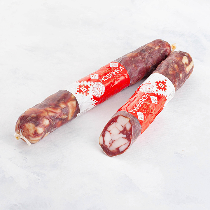 шпик, говядина, свинина, комплексная пищевая добавка для мясной продукции с йодом (соль пищевая, фиксатор окраски нитрит натрия, йодат калия), комплексная пищевая добавка (регулятор кислотности, декстроза, соль, сухой сироп глюкозы, специи (чеснок, перец черный), ароматизатор (чеснок, майоран, шафран, фенхель), сахароза, антиокислители. Возможно наличие горчицы, сельдерея, орехов, молока, злаков, содержащих глютен, сои, яиц и продуктов их переработки