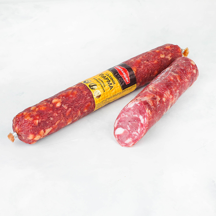 свинина, шпик, соль, молочный белок, лактоза, ароматизатор, специи, пряности (черный перец), регулятор кислотности, антиокислитель, усилитель вкуса и аромата, фиксатор окраски, стартовые культуры микроорганизмов, краситель (кармин).