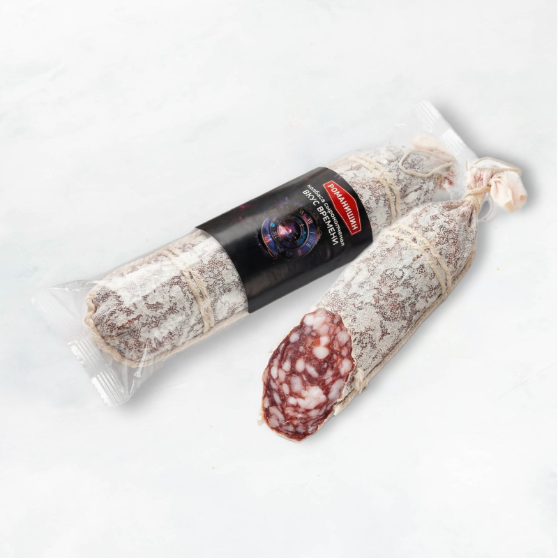 свинина, шпик, соль, сухое обезжиренное молоко, декстроза, мальтодекстрин, стабилизатор, усилитель вкуса и аромата, антиокислители, регулятор кислотности, экстракты (розмарина, дрожжей, кардамона), ароматизатор, пряности (черный перец), фиксатор окраски, краситель (кармины)