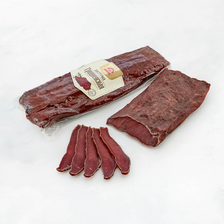Длиннейшая мышца говяжья, соль (содержит йодат калия), мука пшеничная, чеснок, перец черный, кориандр, натуральный краситель,