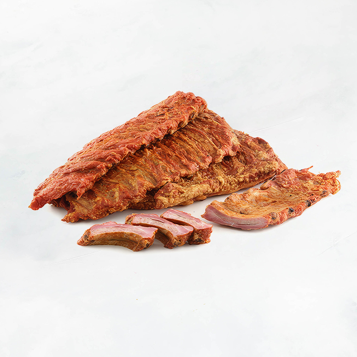 грудореберная часть свиная с ребрами без позвонков, вода, соль, агент антислеживающий ферроционид калия, фиксатор окраски нитрит натрия, йодат калия, усилитель вкуса и аромата натриевая соль, соевый белок, регуляторы кислотности трифосфаты, стабилизаторы пирофосфат натрия, полифосфаты, загустители каррогинан, ксантановая камедь, клетчатка пищевая, антиокислитель аскорбат натрия, краситель кармин.