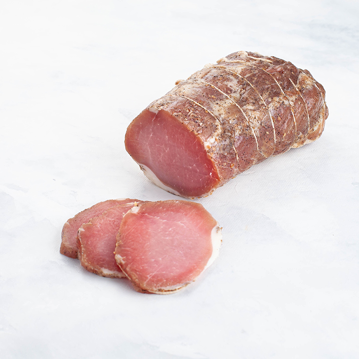 Спинно-поясничная мышца свиная, соль, пищевые обавки, чеснок, сахар, перец черный. может содржать следы сои, сельдерея, лактозы, горчицы, глютена и орехов.