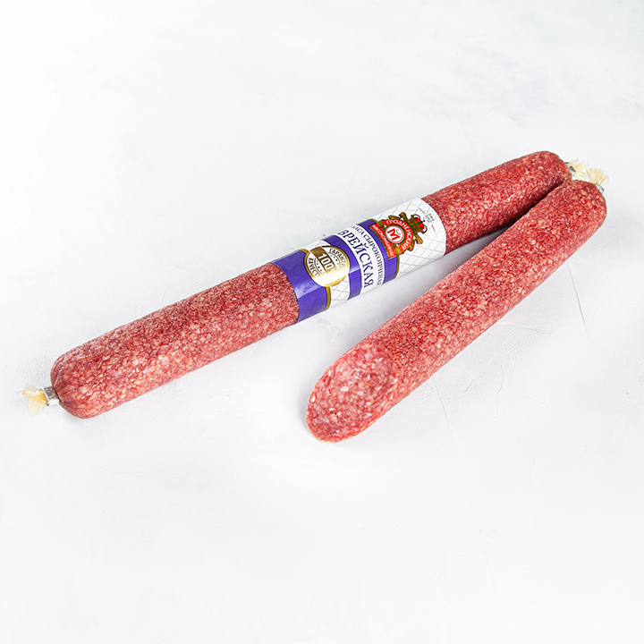 говядина, жир-сырец говяжий, комплексная пищевая добавка (соль (содержит йодат калия), фиксатор окраски), экстракты специй, усилитель вкуса и аромата, ароматизаторы, антиокислитель, чеснок, сельдерей, перец, экстракт паприки, пшеничные волокна, краситель, стартовая культура.