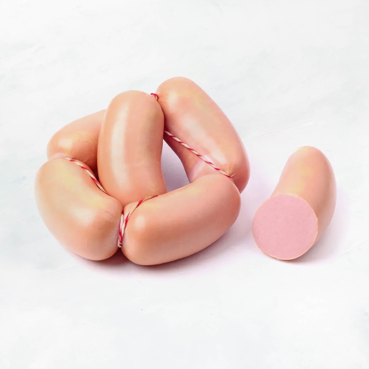 свинина, вода питьевая, говядина, жир-сырец свиной, шкурка свиная, сыворотка молочная, добавка комплексная пищевая (загуститель, мальтодекстрин, декстроза, сахар, регулятор кислотности, усилитель вкуса и аромата, экстракт специй (мускатный орех), соль, кукурузный крахмал, глюкоза, перец, продукты яичные.