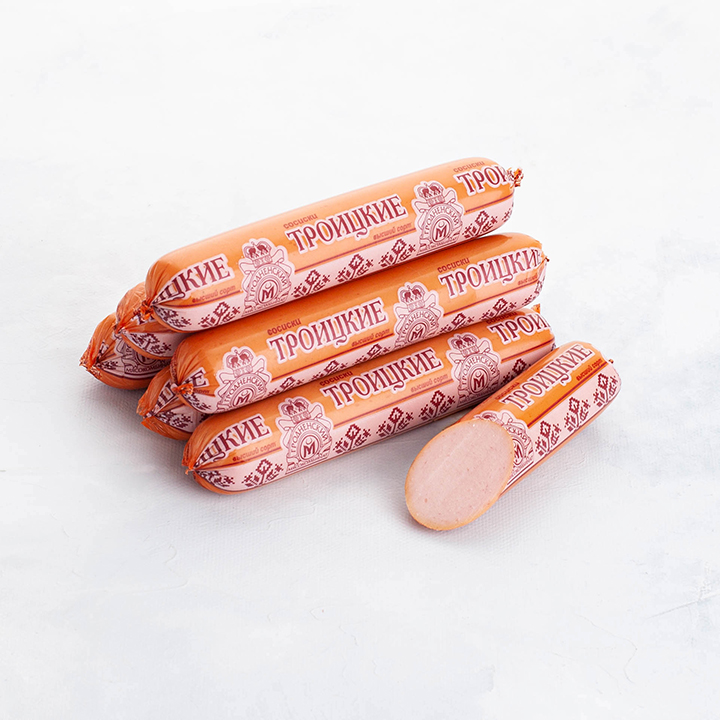 свинина, вода, говядина, жировая эмульсия (вода, жир-сырец говяжий, загустители каррагенан, карбоксиметилцеллюлоза, соль, агент антислеживающий ферроционид калия), сыворотка молочная сухая, фиксатор окраски нитрит натрия, натуральные пряности (сельдерей), антиокислители аскорбиновая кислота, аскорбат натрия, стабилизаторы пирофосфаты, регуляторы кислотности трифосфаты, пирофосфаты, глюконо-дельта лактон, эмульгатор глицерины жирных кислот, камедь рожкового дерева, усилитель вкуса и аромата натриевая соль, лактоза, смесь прряностей (орех мускатный), краситель кармин.