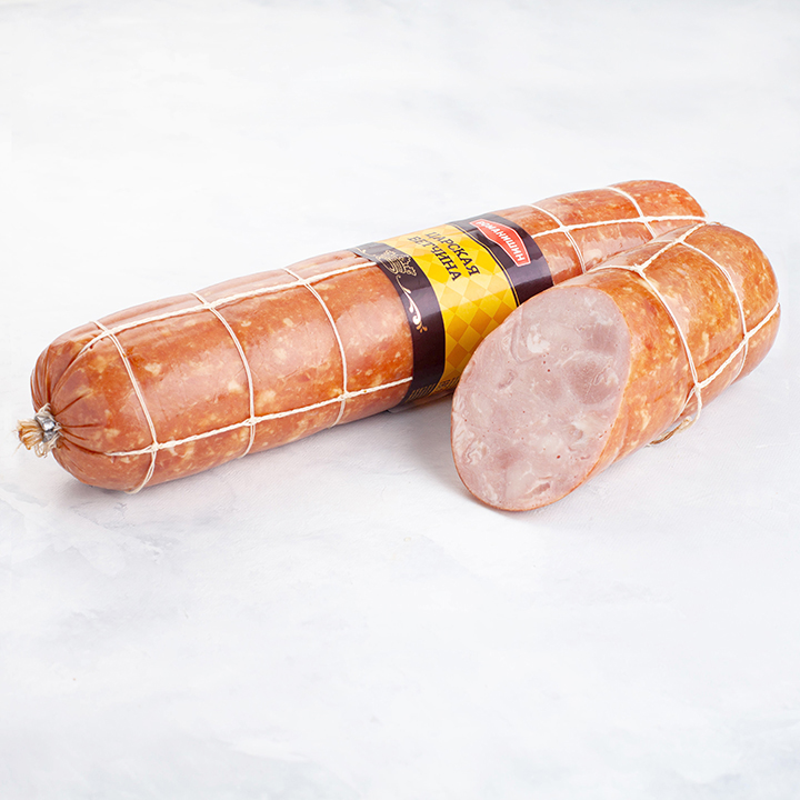 свинина, вода, крахмал картофельный, нитритно-посолочная смесь (соль, фиксатор окраски), регуляторы кислотности стабилизатор, загуститель, усилитель вкуса и аромата, пряности, антиокислитель, ароматизатор, краситель