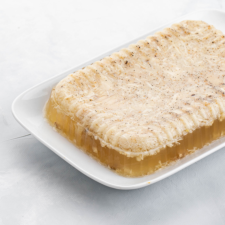 вода питьевая, мясо индейки бескостное без кожи, мясо цыплят-бройлеров бескостное с кожей, желатин пищевой, соль йодированная, комплексная пищевая добавка (горчичный порошок, перец черный молотый, чеснок молотый, горчица молотая, пряности: перец чили, корица, ароматизатор: экстракт цитрусовых, усилитель вкуса и аромата, дрожжевой экстракт, картофельная клетчатка, регулятор кислотности, мальтодекстрин, соль, сахар), чеснок сушенный гранулированный, комплексная пищевая добавка (соль, консервант, сахара (мальтодекстрин, декстроза), экстракты специй (перец), масло лимона), бульон сухой пищевой куриный. Возхможно наличие молока, яиц, сои, сельдерея, злаков, содержащих глютен, арахиса, орехов и продуктов их переработки.