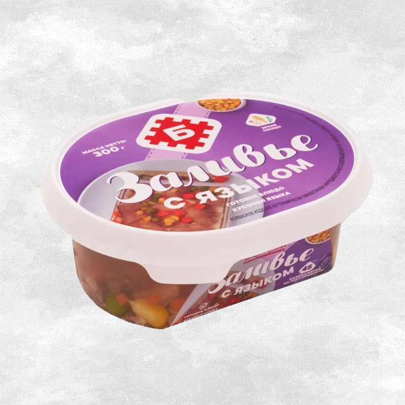 вода питьевая, язык свиной, морковь, желатин пищевой, кукуруза в зернах, горошек зеленый, соль йодированная, комплексная пищевая добавка (декстроза, ароматизатор "Дрожжевой экстракт", соль йодированная, усилитель вкуса и аромата, ароматизатор "Мясо", экстракт любистка, усилитель вкуса и аромата, гидролизат растительного белка), комплексная пищевая добавка (мальтодекстрин, глюкоза, экстракты приправ (чеснок, перец белый), имбирь, антиокислитель; регуляторы кислотности, консервант, соль).
