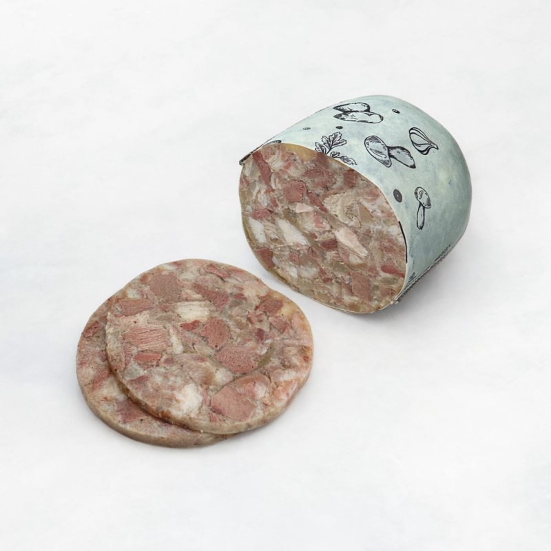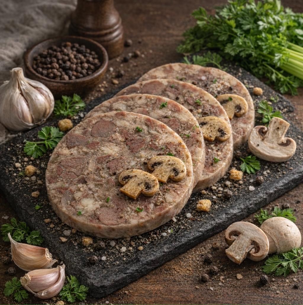 Субпродукты свиные, говяжьи (в том числе печень), бульон, соединительная ткань свиная, говяжья, шампиньоны маринованные, комплексная пищевая добавка (желатин пищевой, соль (содержит йодат калия), мальтодекстрин, чеснок сушеный, усилитель вкуса и аромата, сахар, декстроза, олеорезины перца черного, душистого, лавровый лист), соль (содержит йодат калия), фиксатор окраски, чеснок сушеный, кориандр, тмин, консервант, регулятор кислотности, антиокислители, ароматизатор.