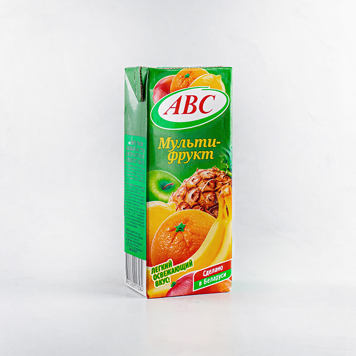 мультифруктовый сок (соки мандарина, апельсина, банана, ананаса, манго, абрикоса, маракуйи, яблока, гуавы, киви, лимона и лайма), яблочный сок, сахар, регулятор кислотности лимонная кислота, вода питьевая подготовленная. Изготовлен из концентрированного сока. Минимальная объемная доля сока - 50 %