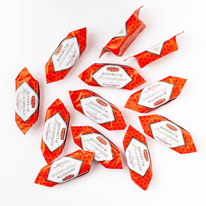 Сахар, шоколадная глазурь (сахар, какао тертое, какао-масло, эмульгатор лецитин соевый, ароматизатор идентичный натуральному "Ваниль"), патока, масло из коровьего молока, вафельный лист (мука пшеничная, крахмал кукурузный, масло подсолнечное рафинированное дезодорированное), молоко цельное сгущенное с сахаром - молоко нормализованное, сахар, спирт этиловый ректификованный не ниже высшей очистки, бренди - спирт этиловый ректификованный из пищевого сырья, спирт коньячный, сахар , смесь пряностей и специй, краситель натуральный -колер сахарный простой, ферментный препарат инвертаза- вырабатывается в организме человека, а также является одним из основных ферментов меда. Конфеты содержат муку пшеничную (глютен), молочные продукты, лицетин соевый. Не содержит ГМО.