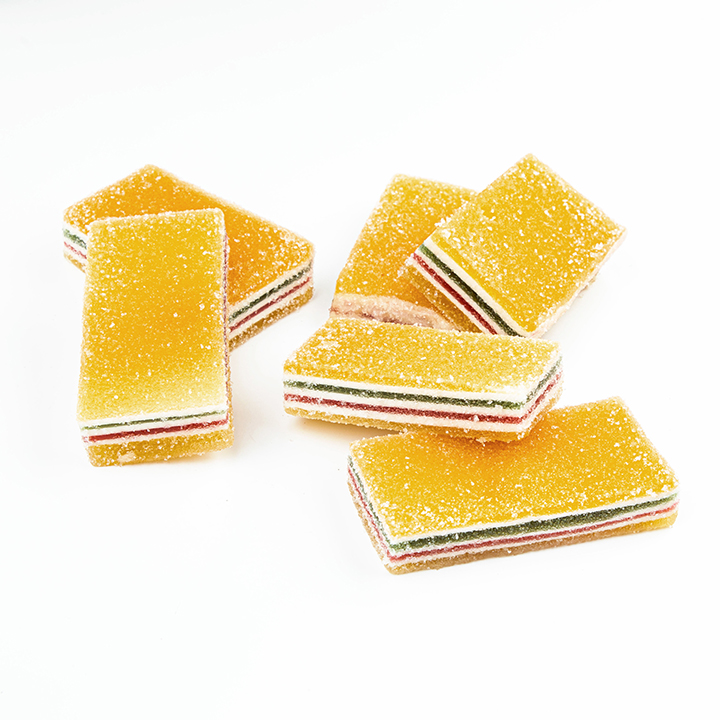 сахар, патока, регулятор кислотности - кислота лимонная, желеобразователь агар, белок яичный, ароматизатор: фруктовое ассорти, красители натуральные: куркумин, кармин, медный комплекс хлорофилла.