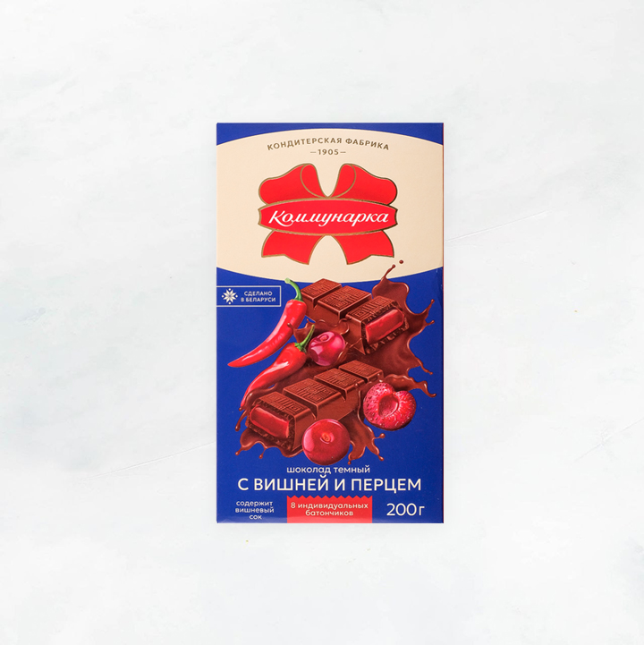 шоколад темный (сахар, какао тертое, масло какао, эмульгаторы, ароматизатор натуральный "Ваниль"), начинка желейно-фруктовая (сахар, патока, жир кондитерский (рафинированные, дезодорированные растительные масла в натуральном и модифицированном виде, антиокислители), агент влагоудерживающий сорбитовый сироп, регуляторы кислотности, концентрат вишневого сока, спирт этиловый ректификованный не ниже высшей очистки, агент желирующий пектин цитрусовый, ароматизаторы ("Вишня", "Чили"), эмульгатор, комплексная пищевая добавка краситель "Кармин", ароматизатор натуральный "Сухие духи" (корица, перец душистый, мускатный орех, имбирь, бадьян, кардамон, перец черный, натуральные масла гвоздики и кассии, агент антислеживающий).