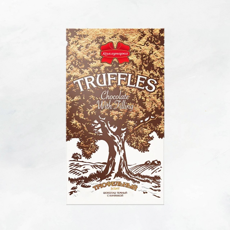 шоколад темный (сахар, какао тертое, масло какао, эмульгаторы, ароматизатор натуральный "Ваниль"), начинка кремовая (сахар, жир кондитерский (рафинированные дезодорированные растительные масла, антиокислители), комплексная пищевая добавка "Денмальт Дарк М" (пермеат молочный сухой, сахар жженый карамелизированный, краситель натуральный, вещества вкусоароматические, натуральный ароматизатор экстракт какао), сыворотка молочная сухая, какао тертое, масло какао, спирт этиловый ректификованный не ниже высшей очистки, ароматизаторы ("Трюфель", "Раф"), эмульгаторы, соль поваренная пищевая йодированная)