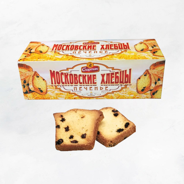 мука пшеничная, сахарная пудра, продукты яичные, маргарин (масла растительные дезодорированные (пальмовое, подсолнечное), вода, соль йодированная (содержит йодат калия, агент антислеживающий), эмульгаторы (лецитин соевый, моно и диглицериды жирных кислот), консервант, краситель (бета-каротин), ароматизатор), виноград сушеный без косточек, масло сливочное, разрыхлитель, ароматизатор "Ванилин".