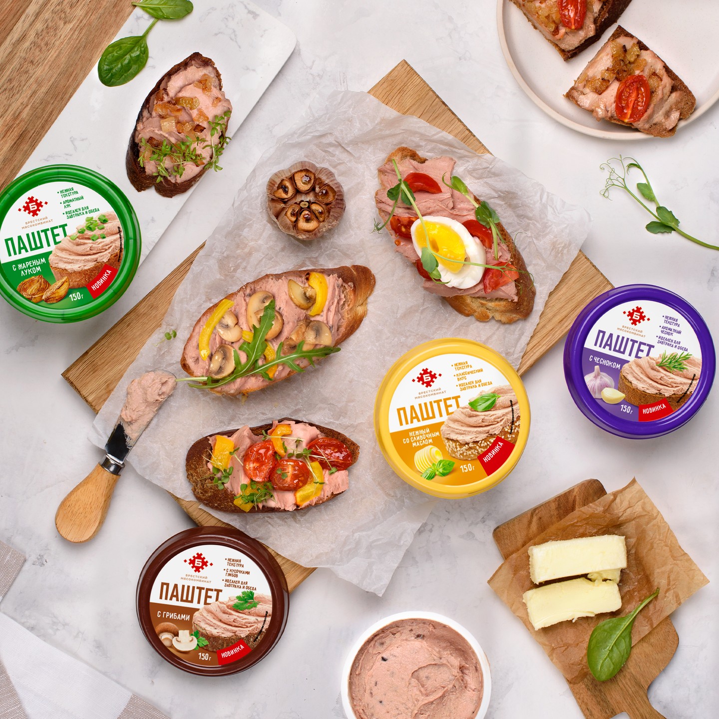 - Паштет со сливочным маслом: Нежный, мягкий паштет со сливочным вкусом, самый универсальный из всех, рекомендуем начать знакомство с паштетной линейкой именно с него.