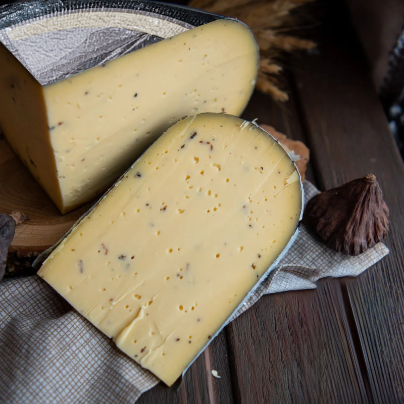 Наша новинка Сыр Формаджио с черным трюфелем - это полутвердый сыр с добавлением черного трюфеля - яркий самобытный представитель голландского сыроварения. Сыр настолько самодостаточен, что его можно подавать как отдельное блюдо. Пряный при этом нежно сливочный вкус и яркий аромат трюфелей, раскрывается постепенно и ублажает все ваши вкусовые рецепторы.