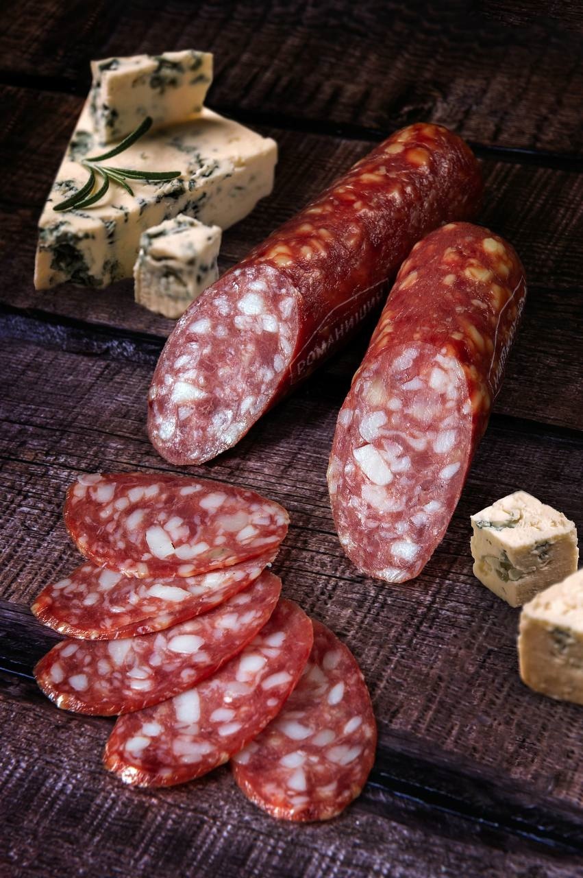Колбаса с сыром Мон Блю— настоящий деликатес, который непременно покорит гурманов. Колбаса имеет насыщенный мясной вкус с элегантными нотками сыра. Продукт станет замечательной закуской к вину.